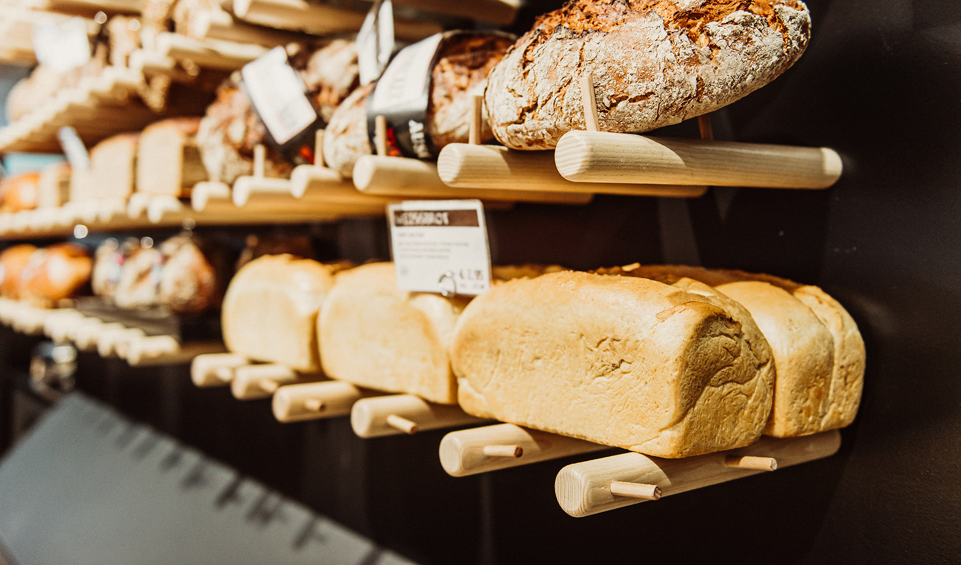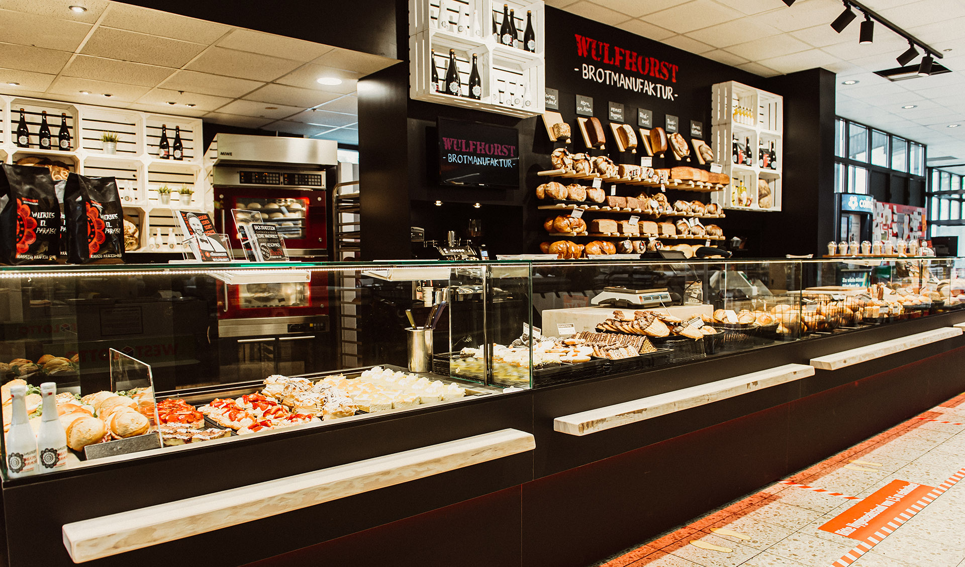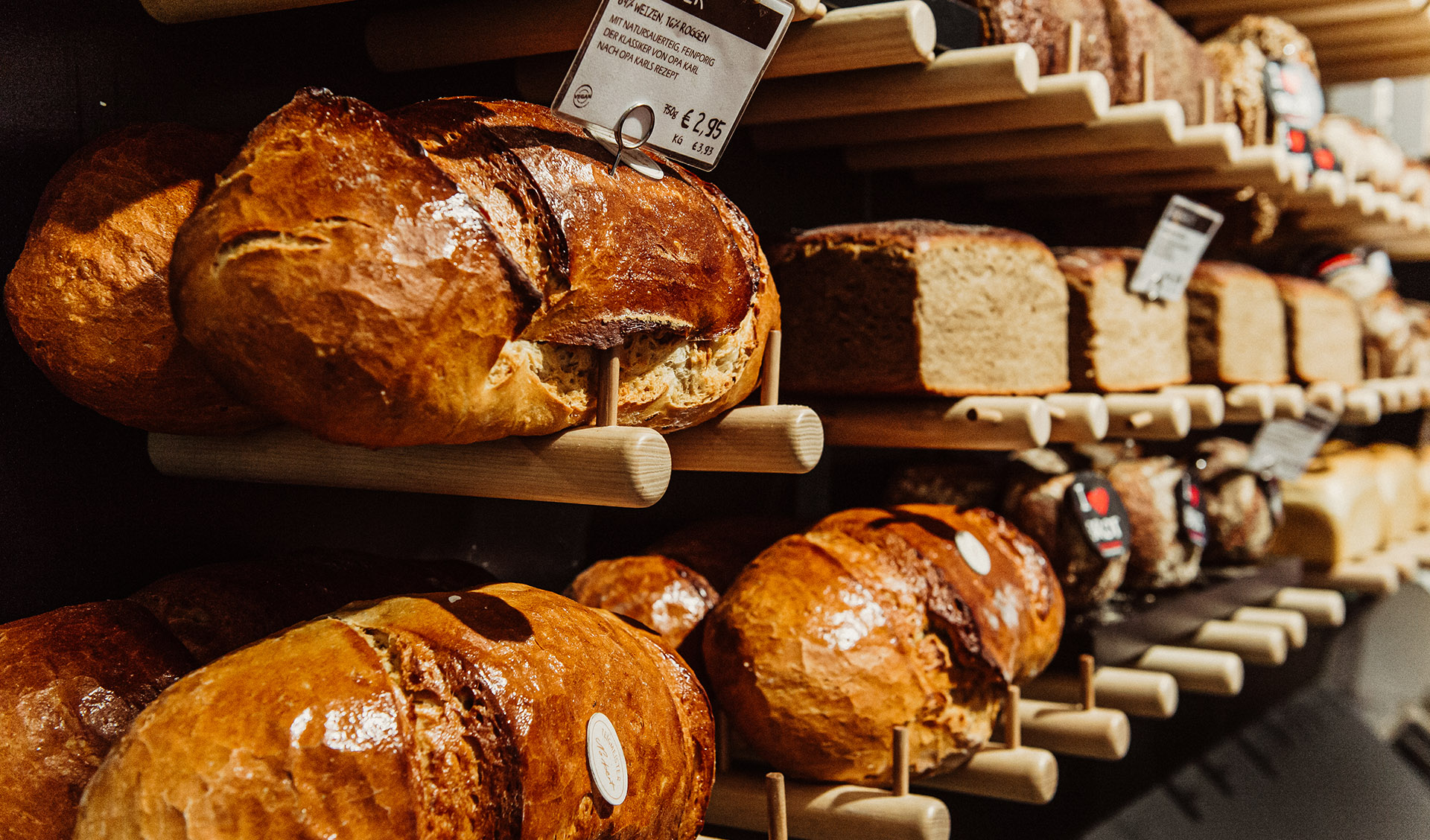 Individuelle Regale und gemütliche Sitznischen nutzen jeden Quadratmeter optimal. Offene Brotpräsentationen und flexible Auslagen für abwechslungsreiche Warenpräsentation.