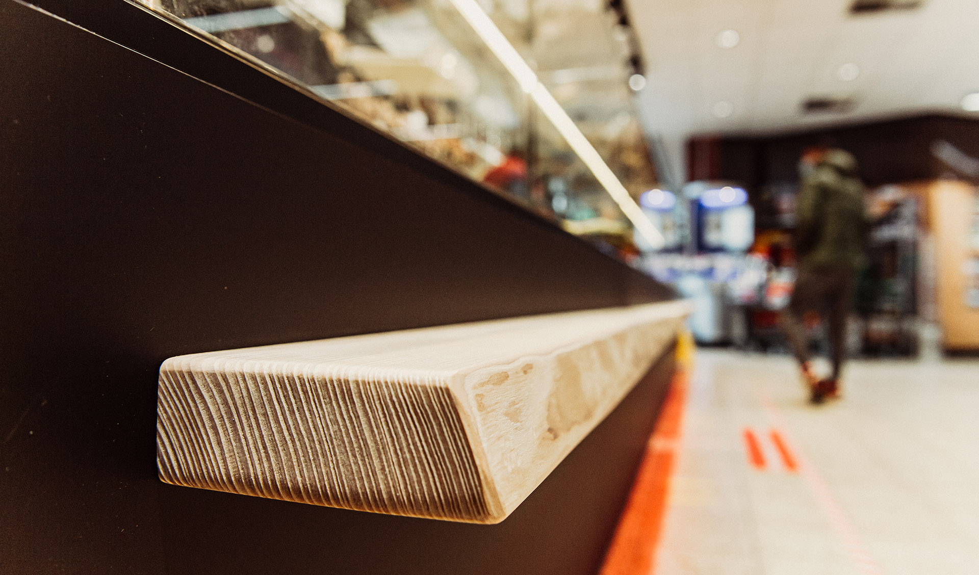 Natürliches Holz kombiniert mit mattem Schwarz. Klare Linien, integrierte LED-Beleuchtung für einen einladenden, zugleich funktionalen Mittelpunkt des Verkaufsraums.