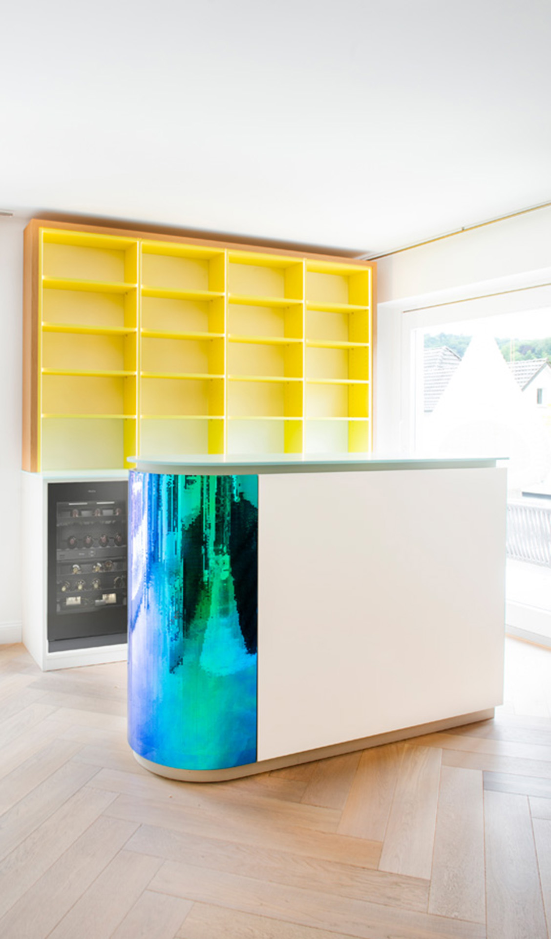 Maßgefertigter Bartresen als Blickfang. Front mit irisierendem Blau-Grün-Spiegel. Sanft gerundete Form, die den Raum auflockert.