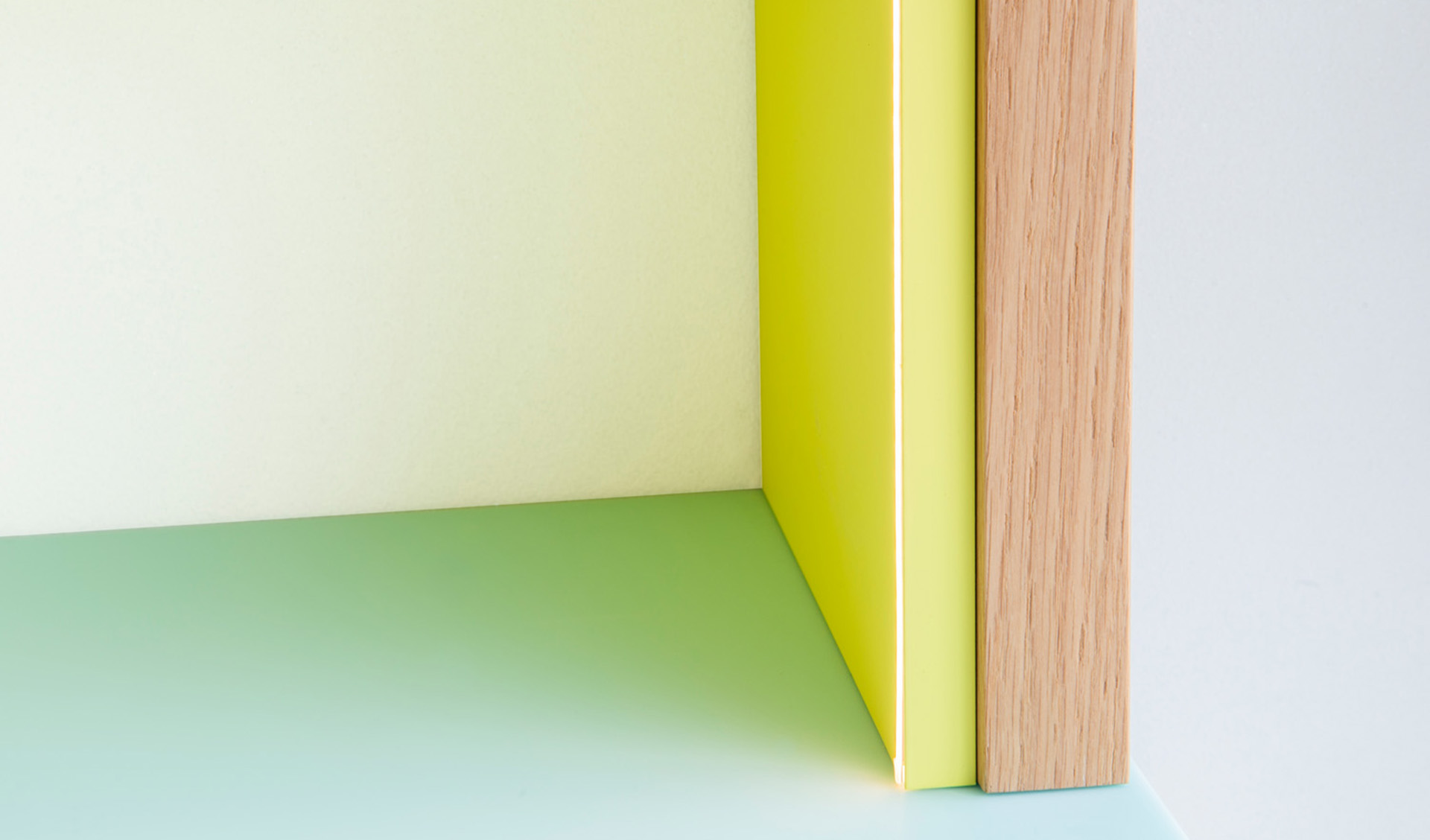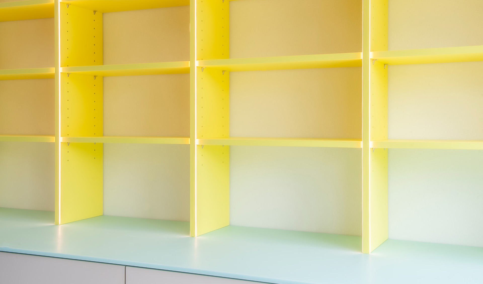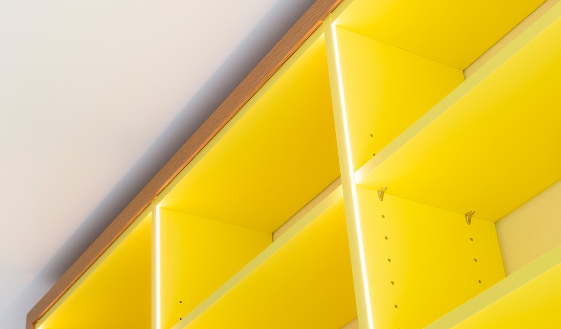 Regal in leuchtendem Gelb schenkt dem Raum Charakter. Das Zusammenspiel aus klaren Linien und frischen Farben lenkt die Aufmerksamkeit auf das besondere Möbelstück.