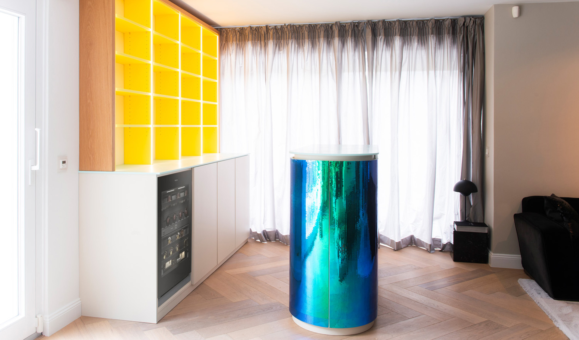 Maßgefertigter Bartresen als Blickfang. Front mit irisierendem Blau-Grün-Spiegel. Sanft gerundete Form, die den Raum auflockert.