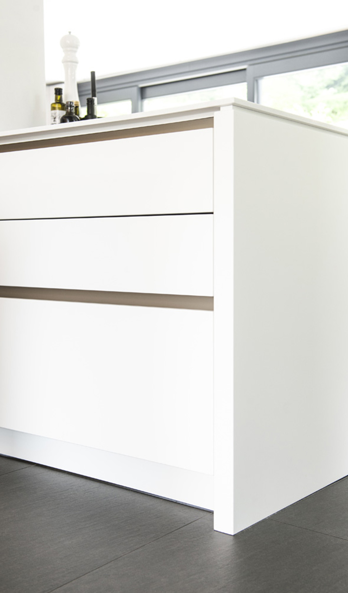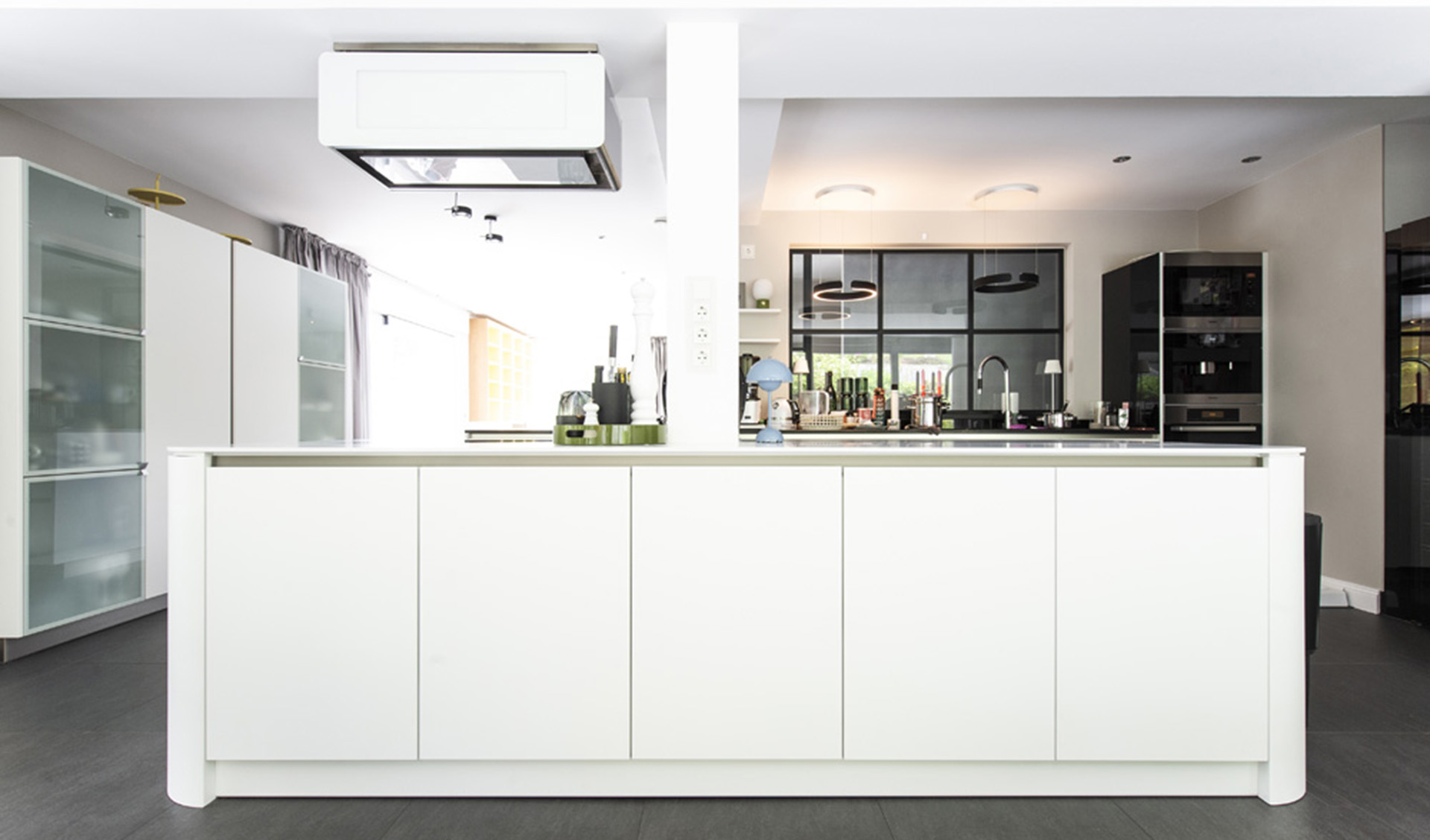 Eine maßgefertigte Kücheninsel in elegantem Weiß, die den Raum öffnet und Klarheit schafft.