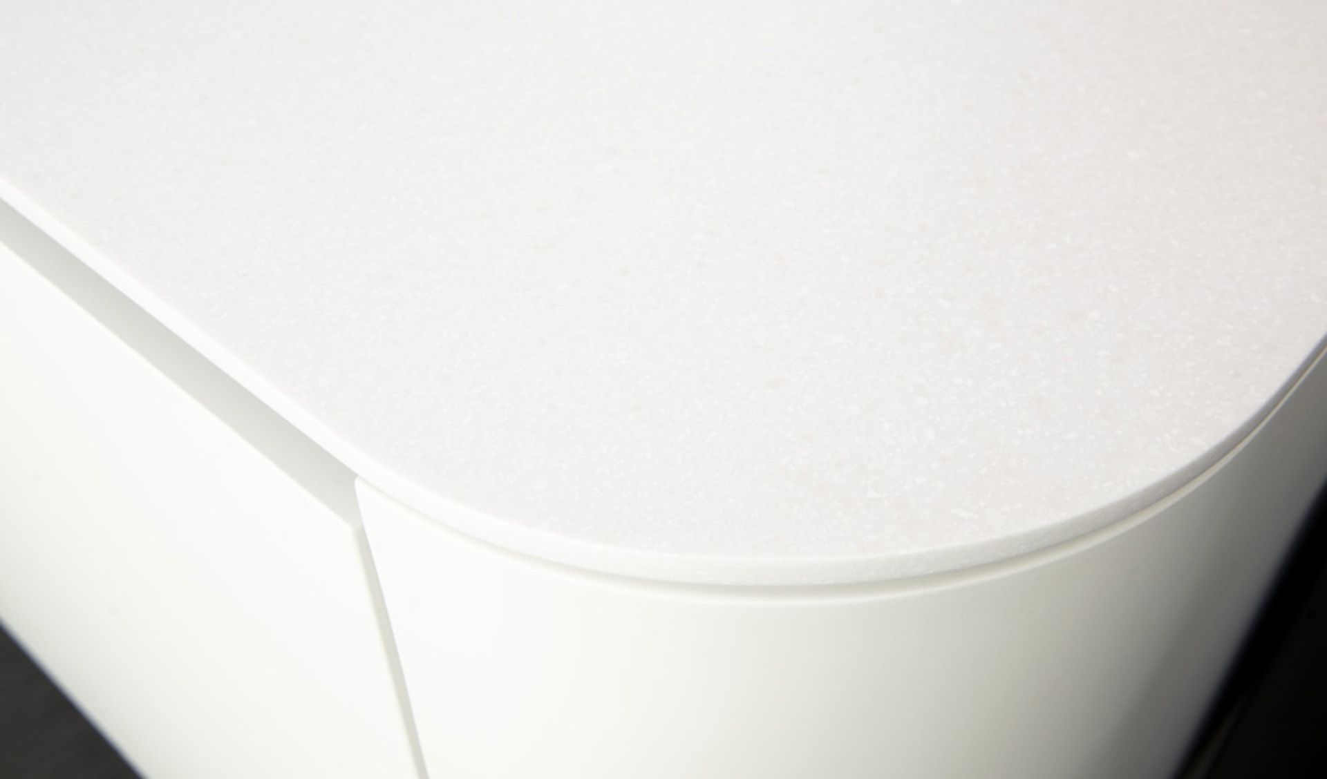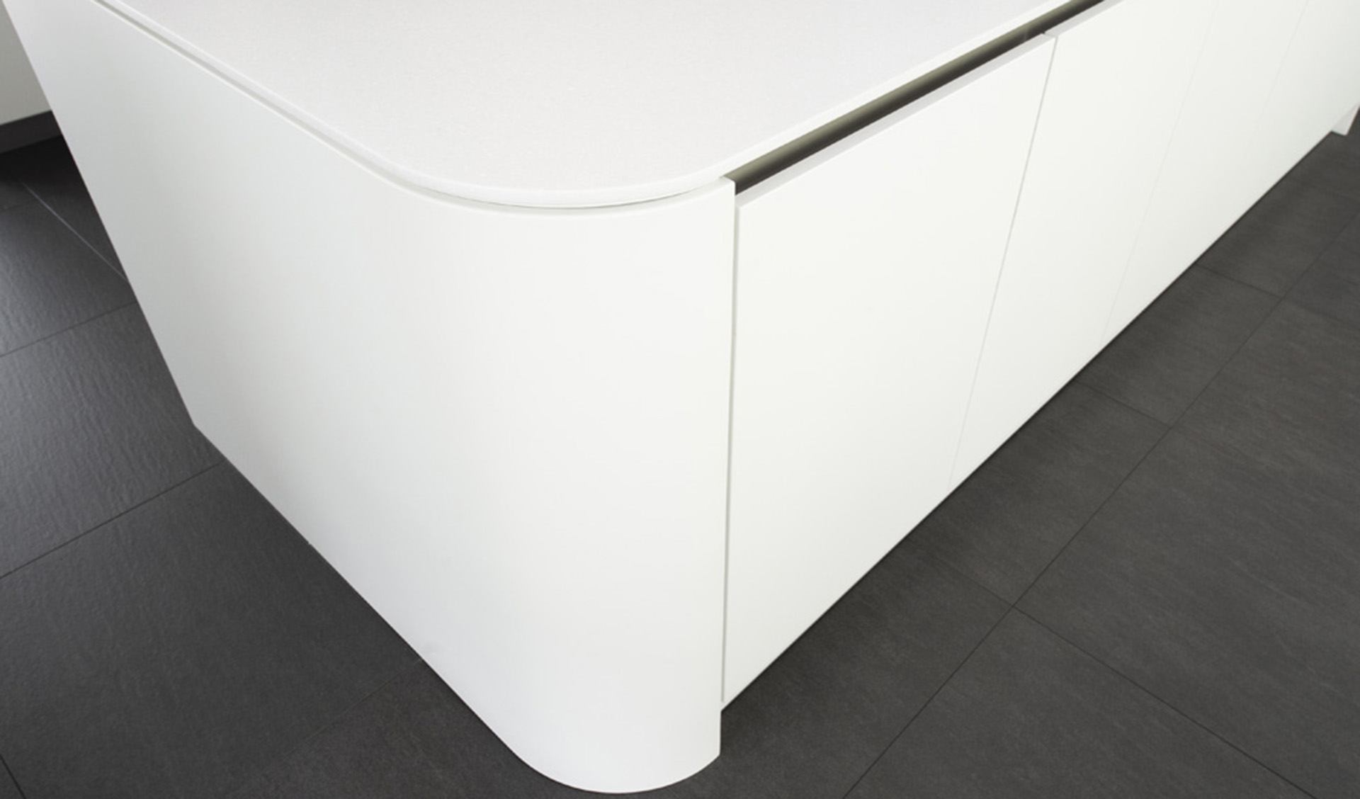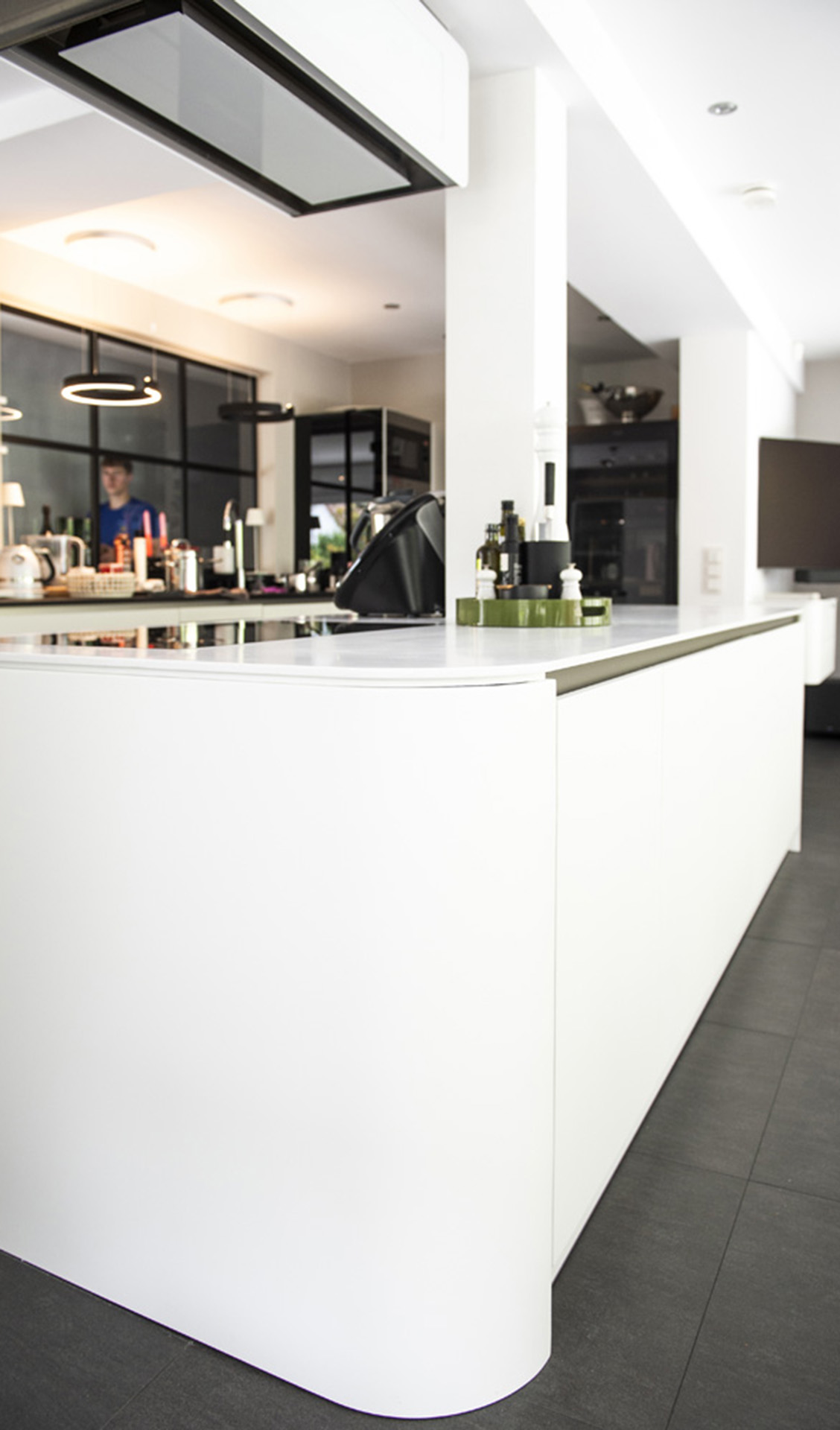 Die sanft abgerundeten Ecken verleihen der Insel Leichtigkeit und sorgen für einen fließenden Übergang zwischen Koch- und Wohnbereich.