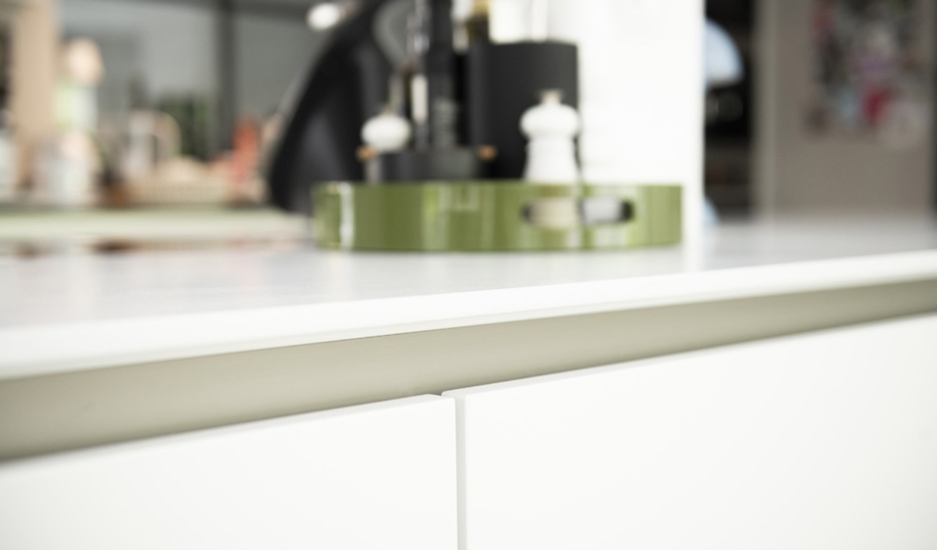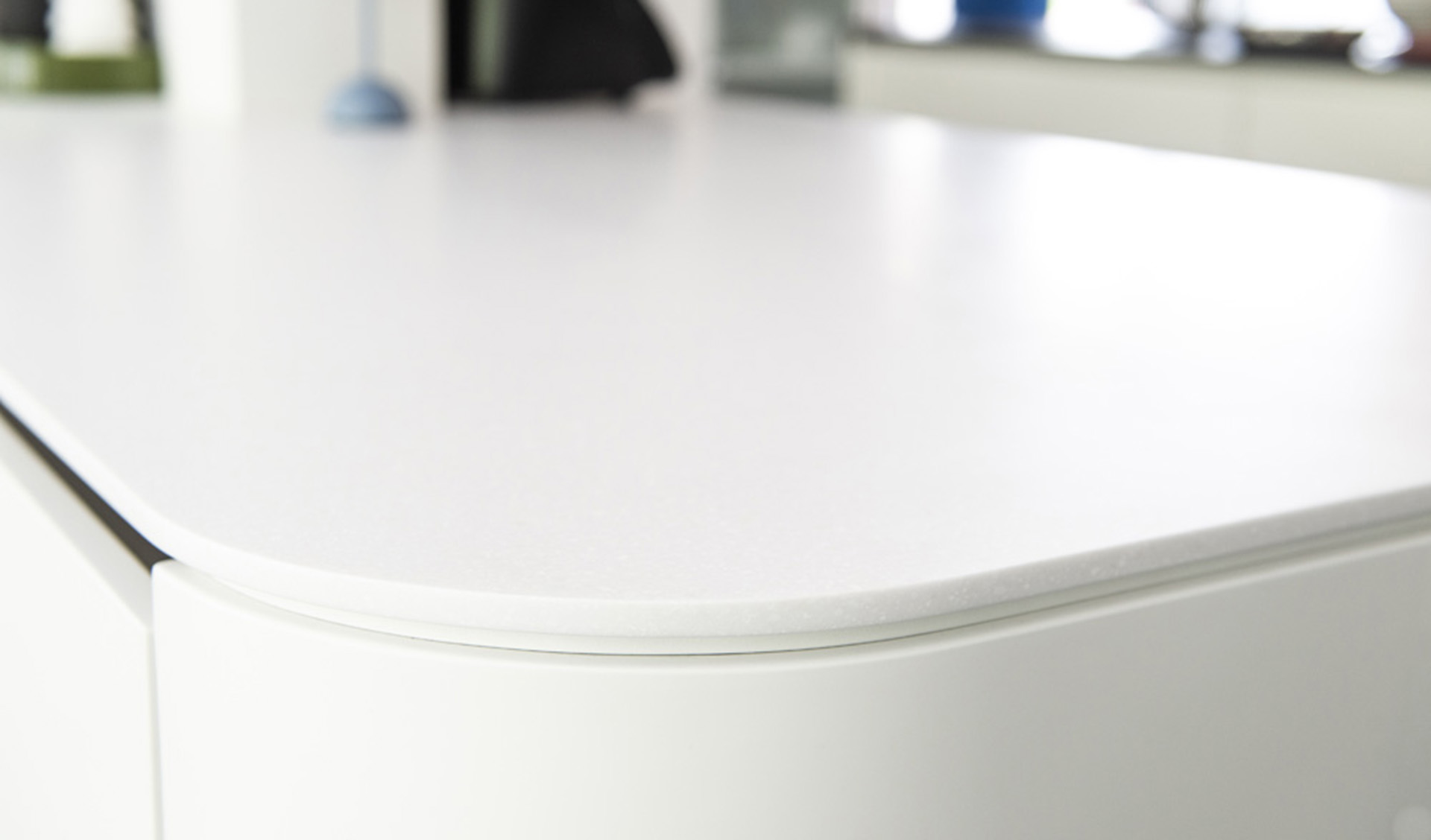Die weiße Arbeitsplatte setzt einen klaren Kontrast zu dunklen Bodenflächen und fügt sich nahtlos in das bestehende Raumkonzept ein.